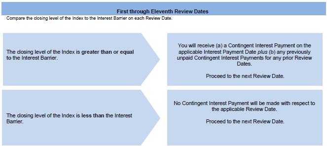 | ● | If the closing level of the Index is greater than or equal to the Interest Barrier on any Review Date, investors will receive, in addition to the Contingent Interest Payment with respect to that Review Date, any previously unpaid Contingent Interest Payments for prior Review Dates. |