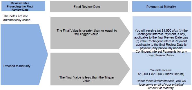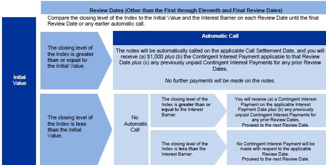 | ● | The notes will be automatically called if the closing level of the Index on any Review Date (other than the first through eleventh and final Review Dates) is greater than or equal to the Initial Value. |