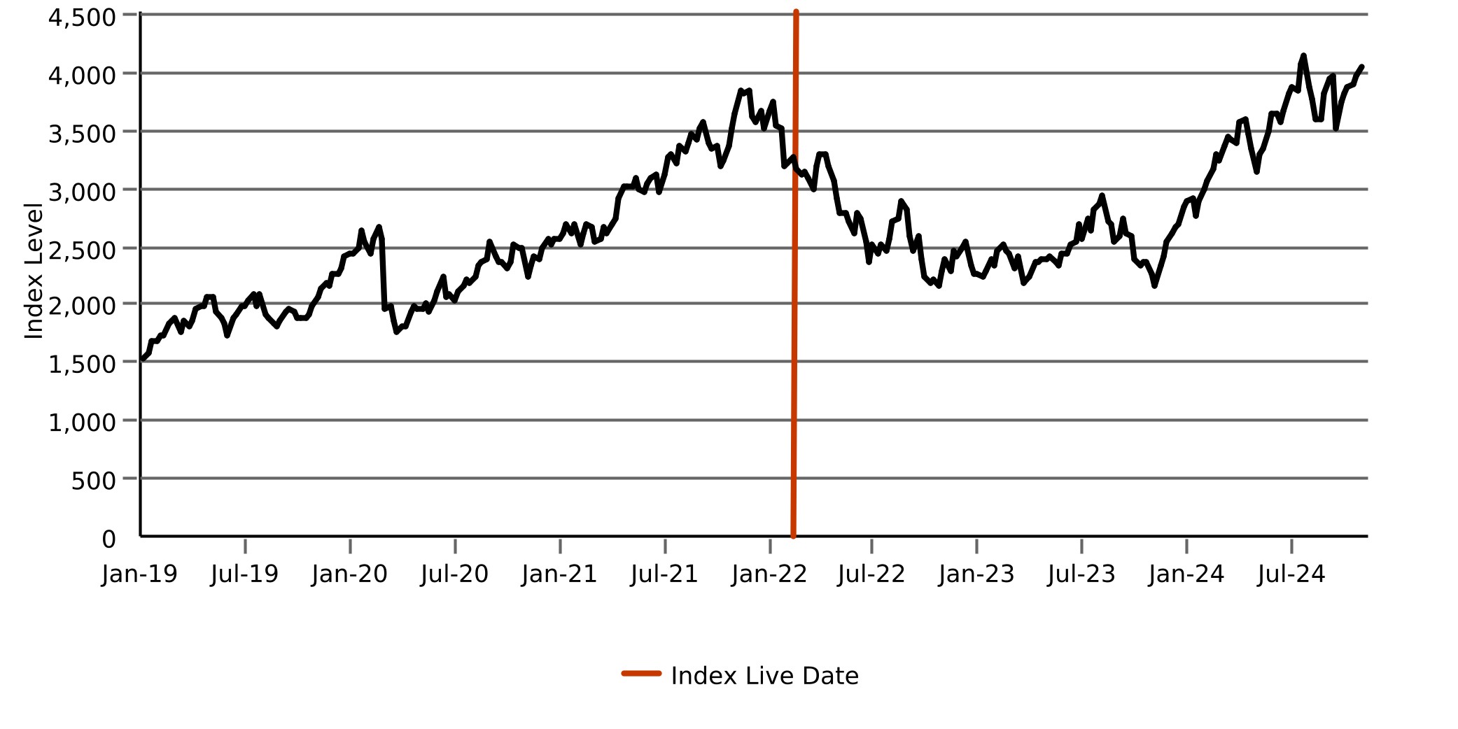 The following graph sets forth the hypothetical back-tested performance of the Index based on the hypothetical back-tested weekly closing levels of the Index from January 4, 2019 through February 4, 2022, and the historical performance of the Index based on the weekly historical closing levels of the Index from February 11, 2022 through October 25, 2024. The Index was established on February 11, 2022, as represented by the vertical line in the following graph. All data to the left of that vertical line reflect hypothetical back-tested performance of the Index. All data to the right of that vertical line reflect actual historical performance of the Index. The closing level of the Index on October 25, 2024 was 3,913.42. We obtained the closing levels above and below from the Bloomberg Professional® service ("Bloomberg"), without independent verification.