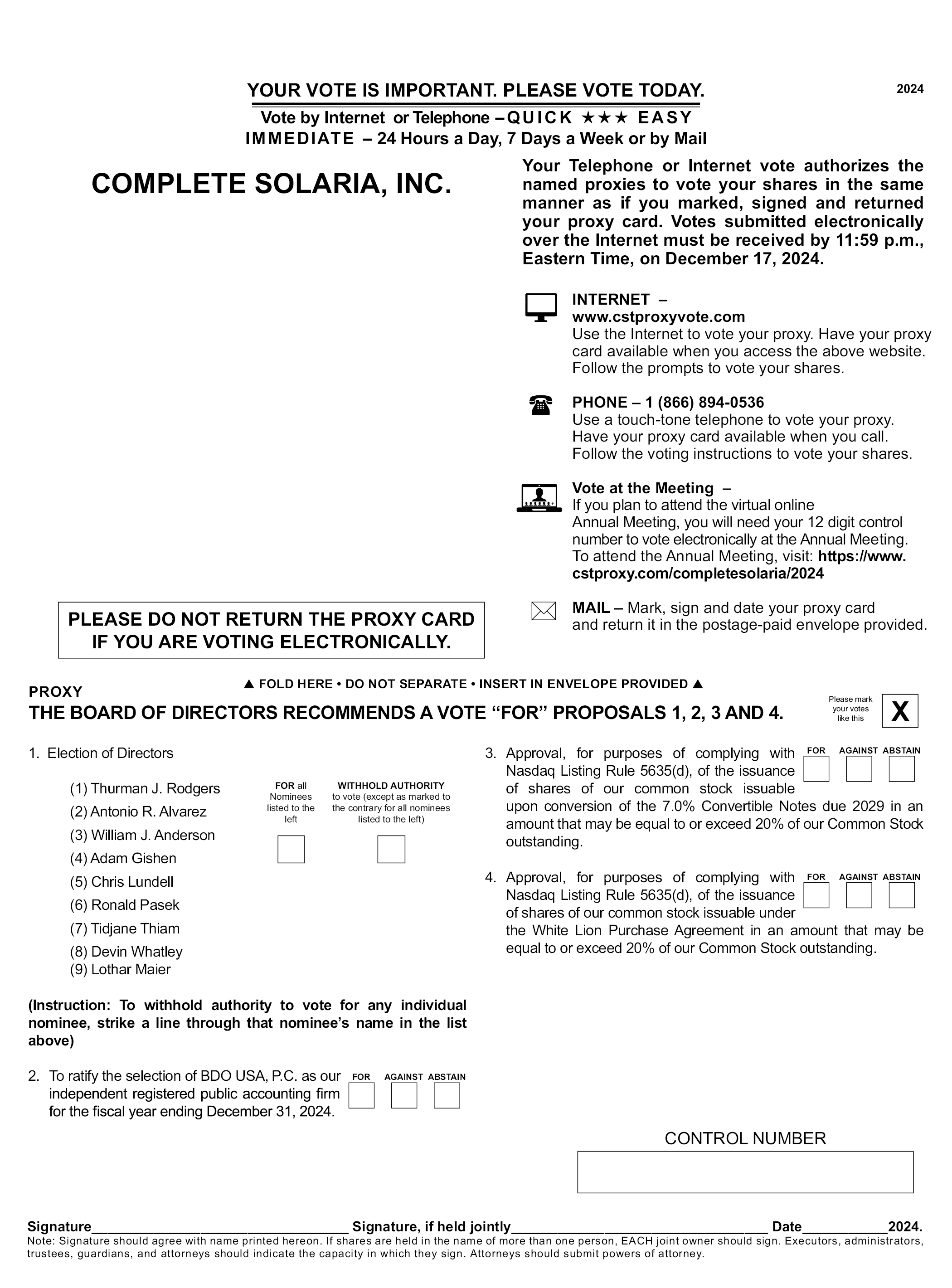 2024 YOUR VOTE IS IMPORTANT. PLEASE VOTE TODAY. IMMEDIATE - 24 Hours a Day, 7 Days a Week or by Mail Vote by Internet or Telephone - QUICK EASY COMPLETE SOLARIA, INC. INTERNET – www.cstproxyvote.com Use the Internet to vote your proxy. Have your proxy card available when you access the above website. Follow the prompts to vote your shares. PHONE – 1 (866) 894-0536 Use a touch-tone telephone to vote your proxy. Have your proxy card available when you call. Follow the voting instructions to vote your shares. Vote at the Meeting – If you plan to attend the virtual online Annual Meeting, you will need your 12 digit control number to vote electronically at the Annual Meeting. To attend the Annual Meeting, visit: https://www.cstproxy.com/completesolaria/2024 MAIL – Mark, sign and date your proxy card and return it in the postage-paid envelope provided. Your Telephone or Internet vote authorizes the named proxies to vote your shares in the same manner as if you marked, signed and returned your proxy card. Votes submitted electronically over the Internet must be received by 11:59 p.m., Eastern Time, on December 17, 2024. PLEASE DO NOT RETURN THE PROXY CARD IF YOU ARE VOTING ELECTRONICALLY. FOLD HERE DO NOT SEPARATE INSERT IN ENVELOPE PROVIDED PROXY THE BOARD OF DIRECTORS RECOMMENDS A VOTE “FOR” PROPOSALS 1, 2, 3 AND 4. Please mark your votes like this X 1. Election of Directors (1) Thurman J. Rodgers (2) Antonio R. Alvarez (3) William J. Anderson (4) Adam Gishen (5) Chris Lundell (6) Ronald Pasek (7) Tidjane Thiam (8) Devin Whatley (9) Lothar Maier (Instruction: To withhold authority to vote for any individual nominee, strike a line through that nominee’s name in the list above) 2. To ratify the selection of BDO USA, P.C. as our independent registered public accounting firm for the fiscal year ending December 31, 2024. FOR AGAINST ABSTAIN FOR all Nominees listed to the left WITHHOLD AUTHORITY to vote (except as marked to the contrary for all nominees listed to the left) 3. Approval, for purposes of complying with Nasdaq Listing Rule 5635(d), of the issuance of shares of our common stock issuable upon conversion of the 7.0% Convertible Notes due 2029 in an amount that may be equal to or exceed 20% of our Common Stock outstanding. 4. Approval, for purposes of complying with Nasdaq Listing Rule 5635(d), of the issuance of shares of our common stock issuable under the White Lion Purchase Agreement in an amount that may be equal to or exceed 20% of our Common Stock outstanding. FOR AGAINST ABSTAIN FOR AGAINST ABSTAIN CONTROL NUMBER Signature Signature, if held jointly Date 2024. Note: Signature should agree with name printed hereon. If shares are held in the name of more than one person, EACH joint owner should sign. Executors, administrators, trustees, guardians, and attorneys should indicate the capacity in which they sign. Attorneys should submit powers of attorney