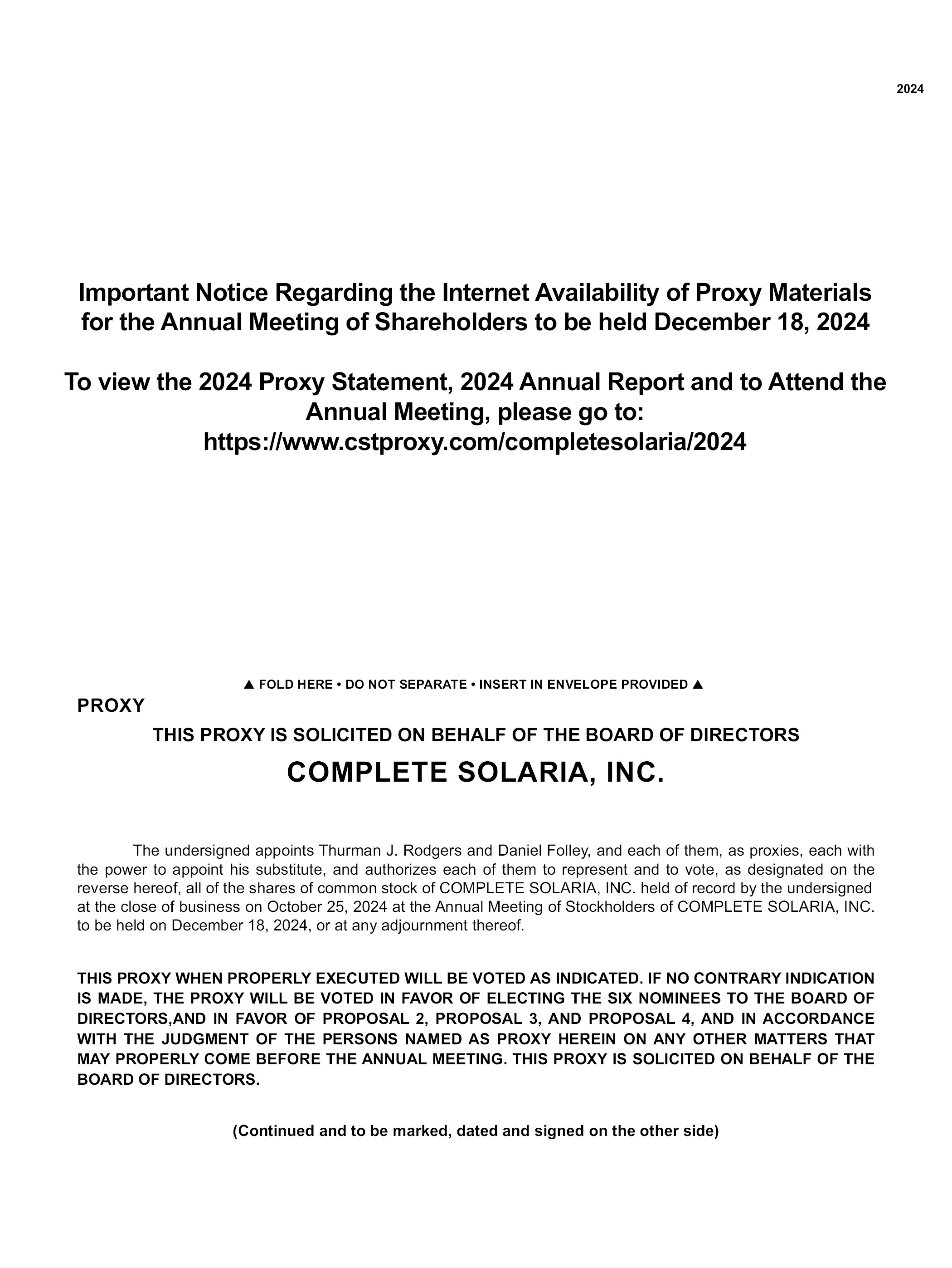 2024 FOLD HERE DO NOT SEPARATE INSERT IN ENVELOPE PROVIDED PROXY THIS PROXY IS SOLICITED ON BEHALF OF THE BOARD OF DIRECTORS COMPLETE SOLARIA, INC. The undersigned appoints Thurman J. Rodgers and Daniel Folley, and each of them, as proxies, each with the power to appoint his substitute, and authorizes each of them to represent and to vote, as designated on the reverse hereof, all of the shares of common stock of COMPLETE SOLARIA, INC. held of record by the undersigned at the close of business on October 25, 2024 at the Annual Meeting of Stockholders of COMPLETE SOLARIA, INC. to be held on December 18, 2024, or at any adjournment thereof. THIS PROXY WHEN PROPERLY EXECUTED WILL BE VOTED AS INDICATED. IF NO CONTRARY INDICATION IS MADE, THE PROXY WILL BE VOTED IN FAVOR OF ELECTING THE SIX NOMINEES TO THE BOARD OF DIRECTORS,AND IN FAVOR OF PROPOSAL 2, PROPOSAL 3, AND PROPOSAL 4, AND IN ACCORDANCE WITH THE JUDGMENT OF THE PERSONS NAMED AS PROXY HEREIN ON ANY OTHER MATTERS THAT MAY PROPERLY COME BEFORE THE ANNUAL MEETING. THIS PROXY IS SOLICITED ON BEHALF OF THE BOARD OF DIRECTORS. (Continued and to be marked, dated and signed on the other side) Important Notice Regarding the Internet Availability of Proxy Materials for the Annual Meeting of Shareholders to be held December 18, 2024 To view the 2024 Proxy Statement, 2024 Annual Report and to Attend the Annual Meeting, please go to: https://www.cstproxy.com/completesolaria/2024